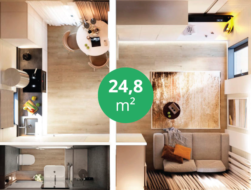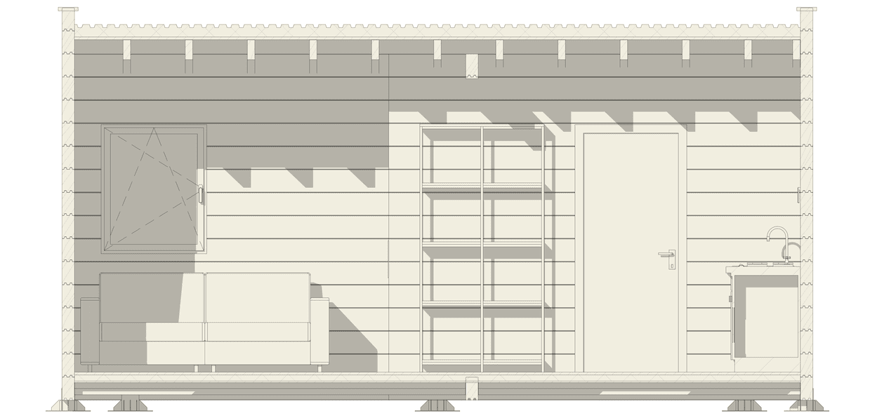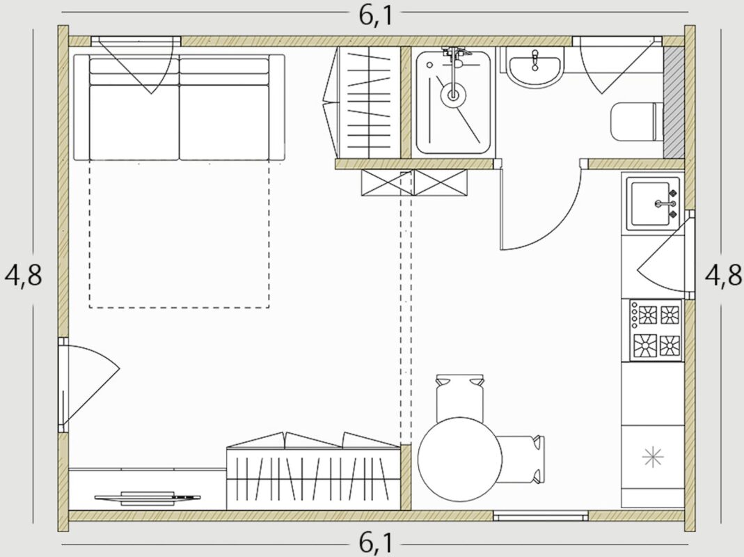A pesar de su pequeño tamaño, Casa MINI es muy funcional e incluye todo lo necesario para vivir: salón, cocina, dormitorio y cuarto de baño y el espacios de almacenamiento.